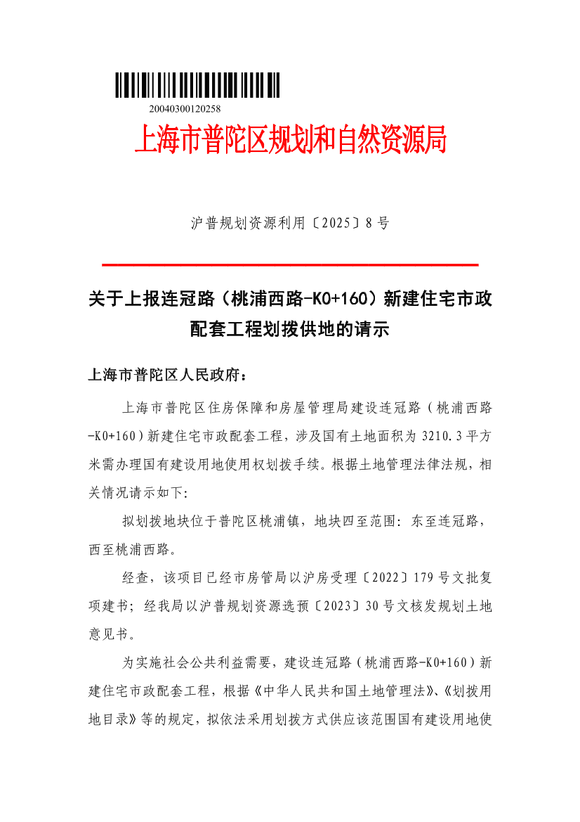 关于上报连冠路(桃浦西路-K0+160)新建住宅市政配套工程划拨供地的请示