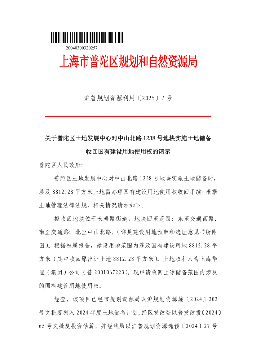 关于普陀区土地发展中心对中山北路1238号地块实施土地储备收回国有建设用地使用权的请示