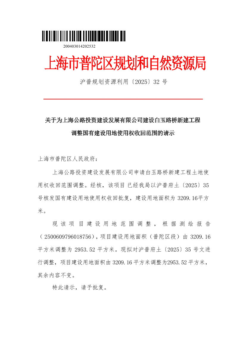 上海公路投资建设发展有限公司申请白玉路桥新建工程土地使用权收回范围调整。经核,该项目已经我局以沪普府土〔2025〕35号核发国有建设用地使用权收回批复,建设用地面积为3209.16平方米。