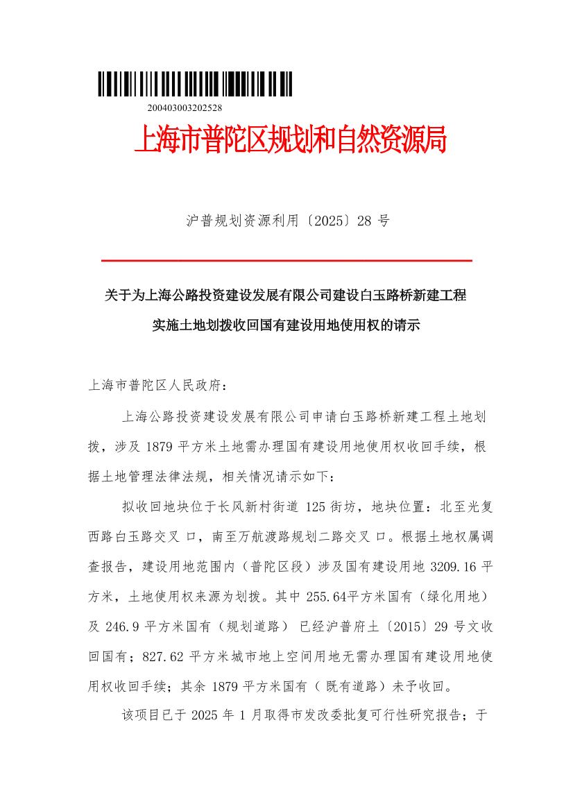 关于为上海公路投资建设发展有限公司建设白玉路桥新建工程实施土地划拨收回国有建设用地使用权的请示