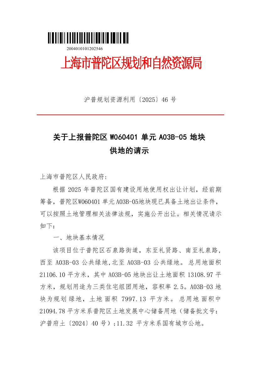 根据2025年普陀区国有建设用地使用权出让计划,经前期筹备,普陀区W060401单元A03B-05地块现已具备土地出让条件,可以按照土地管理相关法律法规,实施公开出让。相关情况请示如下:
