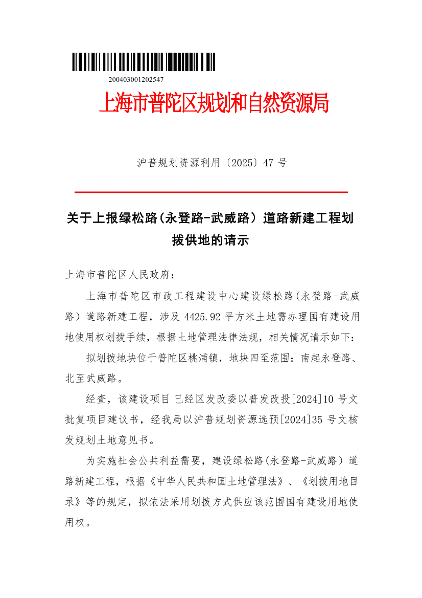 上海市普陀区市政工程建设中心建设绿松路(永登路-武威路)道路新建工程,涉及4425.92平方米土地需办理国有建设用地使用权划拨手续,根据土地管理法律法规,相关情况请示如下: