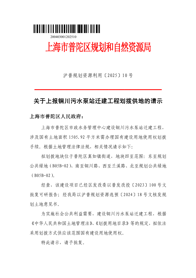 上海市普陀区市政水务管理中心建设铜川污水泵站迁建工程,涉及国有土地面积1505.92平方米需办理国有建设用地使用权划拨手续。根据土地管理法律法规,相关情况请示如下: