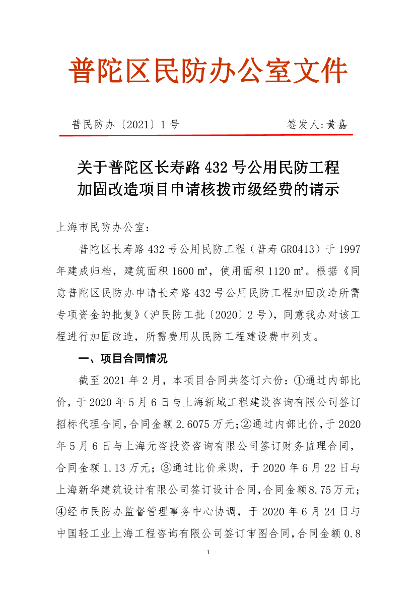 普陀区长寿路432号公用民防工程(普寿GR0413)于1997年建成归档,建筑面积1600㎡,使用面积1120㎡。根据《同意普陀区民防办申请长寿路432号公用民防工程加固改造所需专项资金的批复》(沪民防工批〔2020〕2号),同意我办对该工程进行加固改造,所需费用从民防工程建设费中列支。