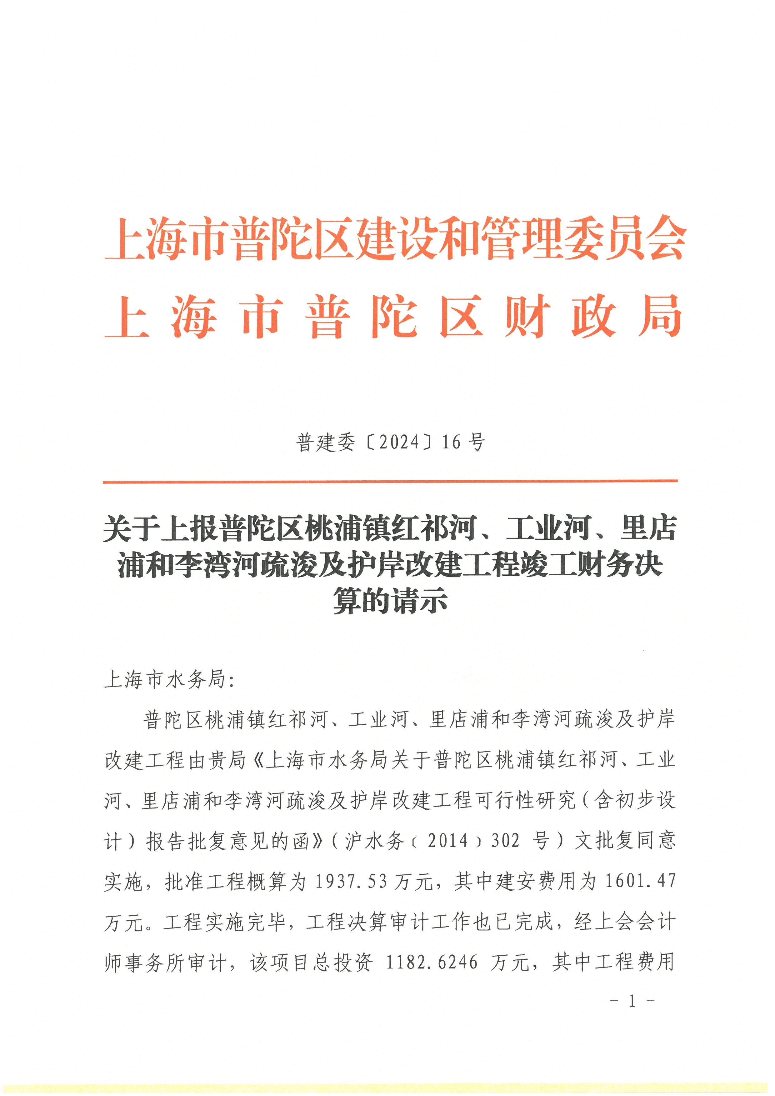 普陀区桃浦镇红祁河、工业河、里店浦和李湾河疏浚及护岸改建工程由贵局《上海市水务局关于普陀区桃浦镇红祁河、工业河、里店浦和李湾河疏浚及护岸改建工程可行性研究(含初步设计)报告批复意见的函》(沪水务﹝2014﹞302号)文批复同意实施,批准工程概算为1937.53万元,其中建安费用为1601.47万元。工程实施完毕,工程决算审计工作也已完成,经上会会计师事务所审计,该项目总投资1182.6246万元,其中工程费用1041.5754万元,独立费用141.0492万元。现将《普陀区桃浦镇红祁河、工业河、里店浦和李湾河疏浚及护岸改建工程(竣工决算)财务监理报告》、《关于普陀区桃浦镇红祁河、工业河、里店浦和李湾河疏浚及护岸改建工程竣工决算的审计报告》上报贵局,请予以审核。