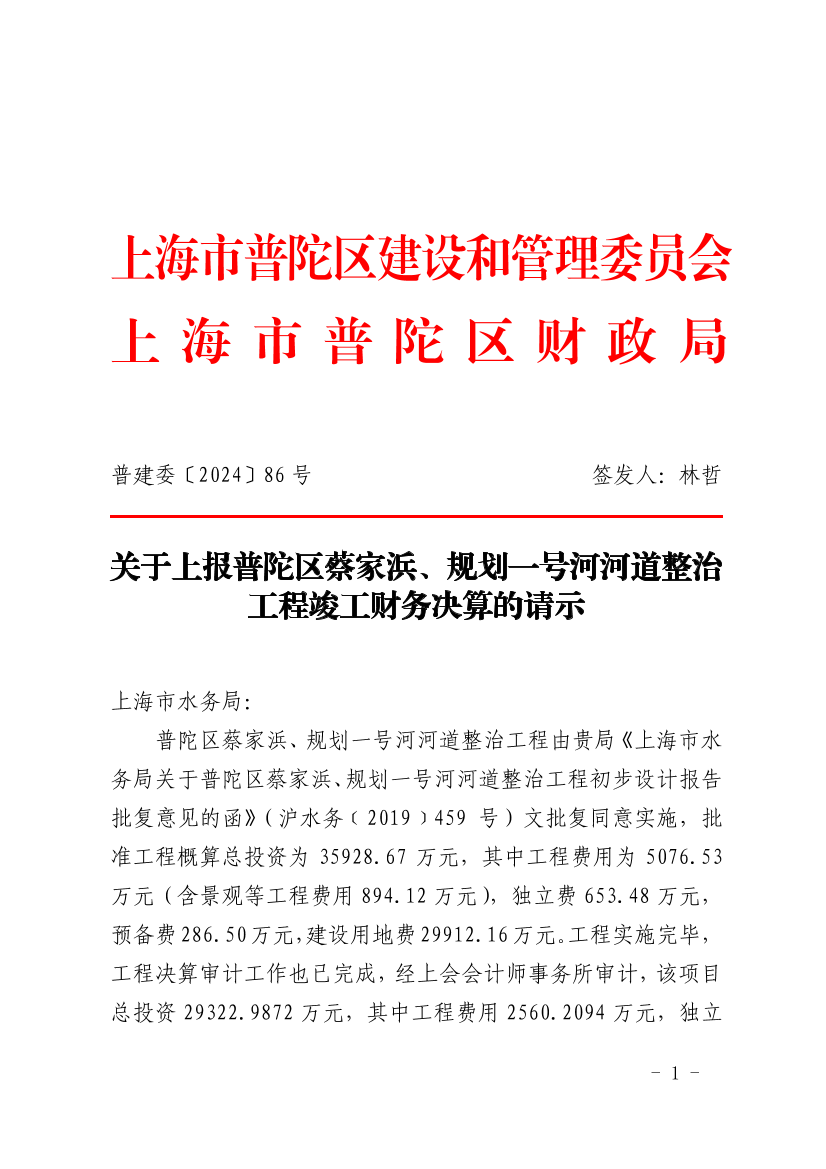 普陀区蔡家浜、规划一号河河道整治工程由贵局《上海市水务局关于普陀区蔡家浜、规划一号河河道整治工程初步设计报告批复意见的函》(沪水务﹝2019﹞459号)文批复同意实施,批准工程概算总投资为35928.67万元,其中工程费用为5076.53万元(含景观等工程费用894.12万元),独立费653.48万元,预备费286.50万元,建设用地费29912.16万元。工程实施完毕,工程决算审计工作也已完成,经上会会计师事务所审计,该项目总投资29322.9872万元,其中工程费用2560.2094万元,独立费用509.1740万元,预备费0.00万元,建设用地费用26253.6038万元。现将《普陀区蔡家浜、规划一号河河道整治工程(竣工决算)财务监理报告》、《关于普陀区蔡家浜、规划一号河河道整治工程竣工决算的审计报告》上报贵局,请予以审核。