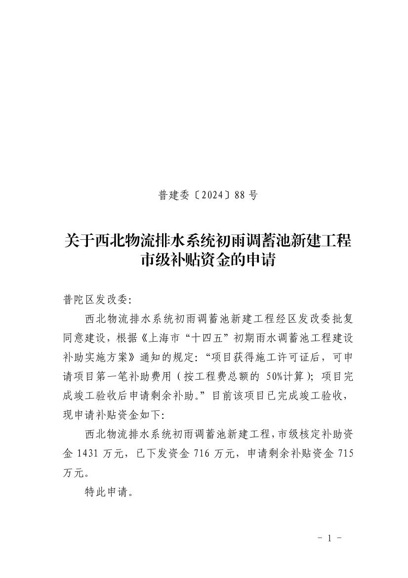 关于西北物流排水系统初雨调蓄池新建工程市级补贴资金的申请