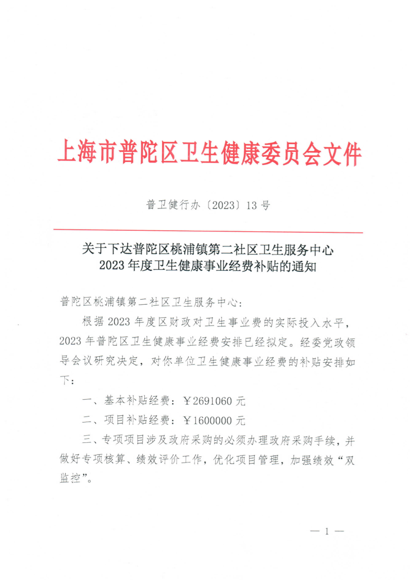 关于下达普陀区桃浦镇第二社区卫生服务中心2023年度卫生健康事业经费补贴的通知