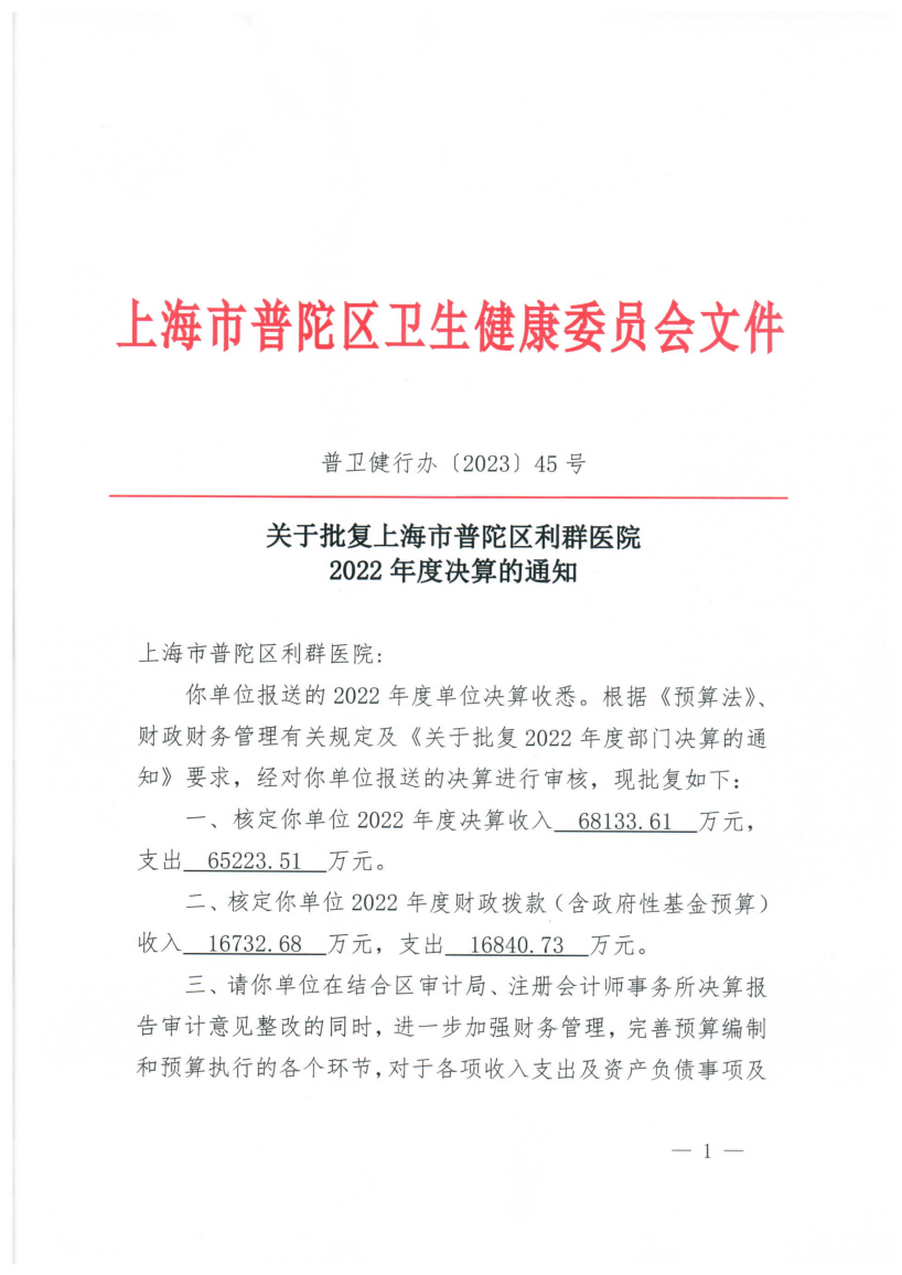 关于批复上海市普陀区利群医院2022年度决算的通知