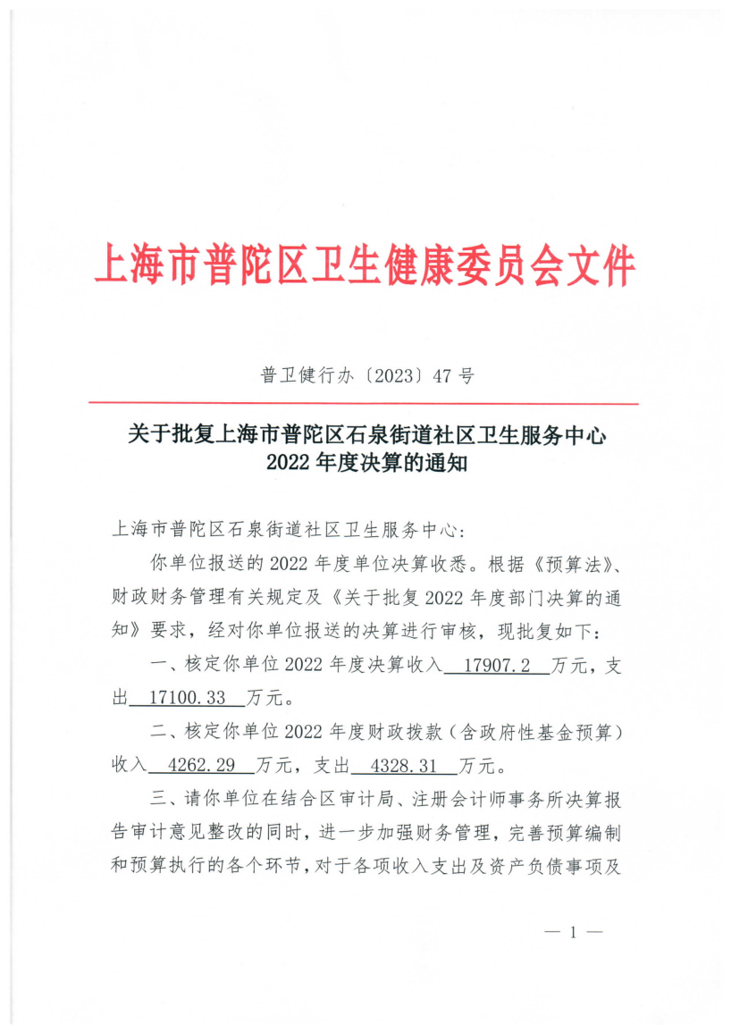 关于批复上海市普陀区石泉街道社区卫生服务中心2022年度决算的通知