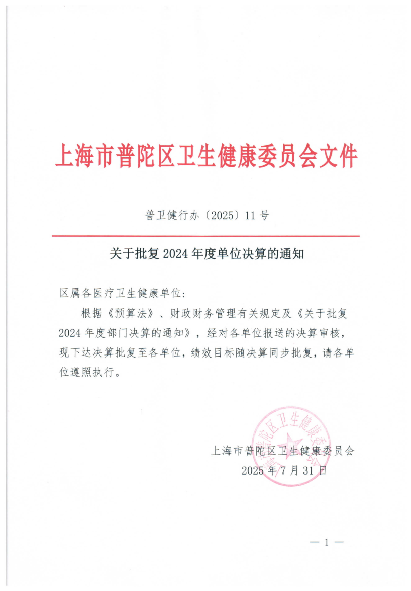 关于下达普陀区人民医院2024年度单位决算的通知
