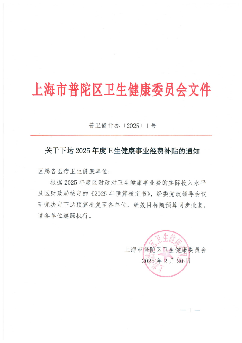 关于下达普陀区人民医院2025年度卫生健康事业经费补贴的通知
