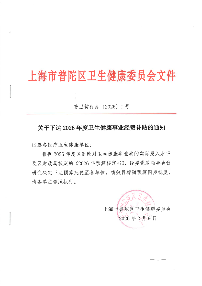 关于下达普陀区妇婴保健院2026年度卫生健康事业经费补贴的通知