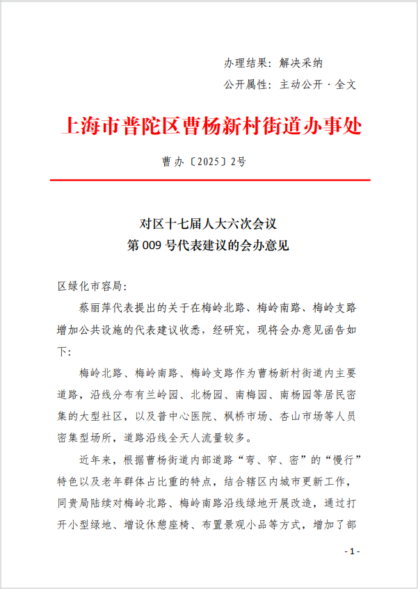 蔡丽萍代表提出的关于在梅岭北路、梅岭南路、梅岭支路增加公共设施的代表建议收悉,经研究,现将会办意见函告如下: