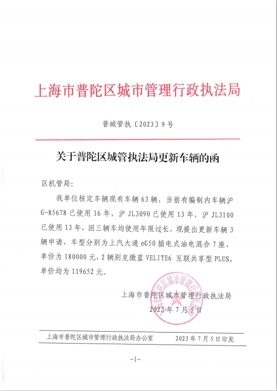 我单位核定车辆现有车辆63辆,当前有编制内车辆沪G-85678已使用16年,沪JL3090已使用13年,沪JL3100已使用13年,因三辆车均使用年限过长,现提出更新车辆3辆申请,车型分别为上汽大通eG50插电式油电混合7座,单价为180000元,2辆别克微蓝VELITE6 互联共享型PLUS,单价均为119652元。