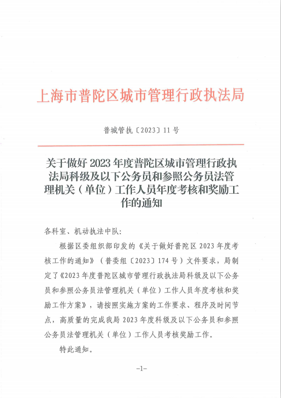 关于做好2023年度普陀区城市管理行政执法局科级及以下公务员和参照公务员法管理机关(单位)工作人员年度考核和奖励工作的通知
