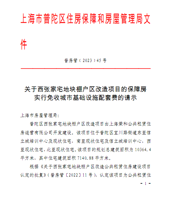 现该公司提出对所建的公共租赁房免收城市基础配套费的申请,根据沪房管财〔2014〕337号文件的有关规定,申请对西张家宅地块棚户区改造项目的公共租赁房实行免收城市基础设施配套费。