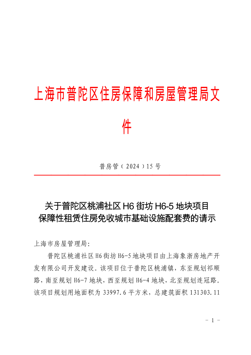 关于普陀区桃浦社区H6街坊H6-5地块项目保障性租赁住房免收城市基础设施配套费的请示