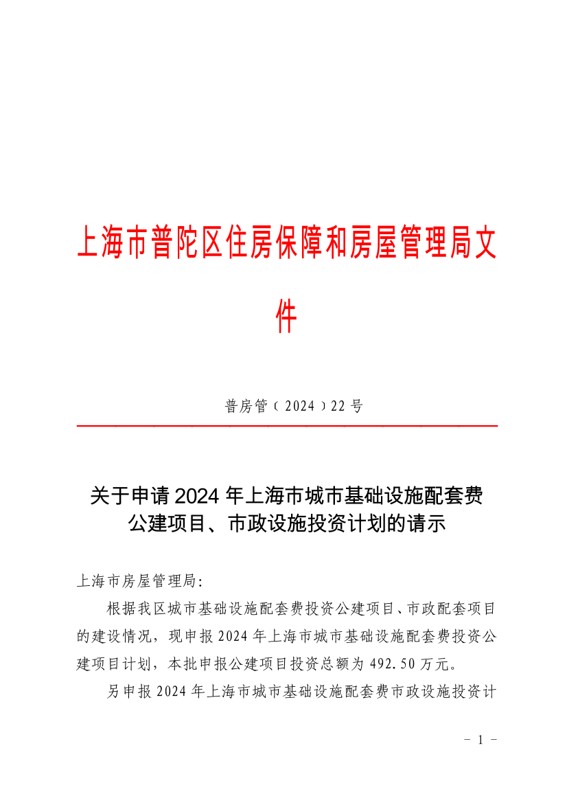 根据我区城市基础设施配套费投资公建项目、市政配套项目的建设情况,现申报2024年上海市城市基础设施配套费投资公建项目计划,本批申报公建项目投资总额为492.50万元。