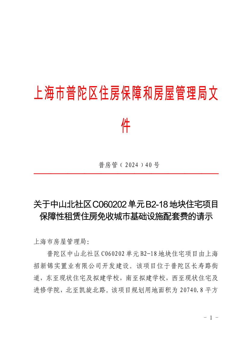 现该公司提出对所配建的公共租赁房免收城市基础配套费的申请,我局对该基地情况进行核实后,根据沪房规范〔2022〕2号文件的有关规定,拟同意普陀区中山北社区C060202单元B2-18地块项目所配建的公共租赁房(共2592.6平方米)实行免收城市基础设施配套费。