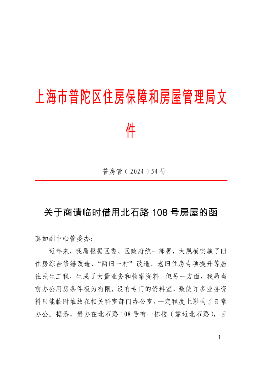 近年来,我局根据区委、区政府统一部署,大规模实施了旧住房综合修缮改造、“两旧一村”改造、老旧住房专项提升等居住民生工程,生成了大量业务和档案资料。但另一方面,我局当前办公用房条件极为有限,没有专门的资料室,致使许多业务资料只能临时堆放在相关科室部门办公室,一定程度上影响了日常办公。据悉,贵办在北石路108号有一栋楼(靠近北石路),目前暂时处于闲置状态。为此特商请贵办将该栋楼的二层以及一层的会议室无偿借与我局,用于相关业务和档案资料存放,我局将派人专项管理。