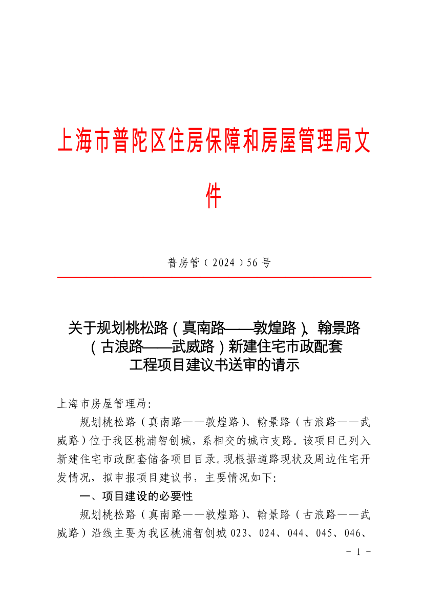关于规划桃松路(真南路——敦煌路)、翰景路(古浪路——武威路)新建住宅市政配套工程项目建议书送审的请示