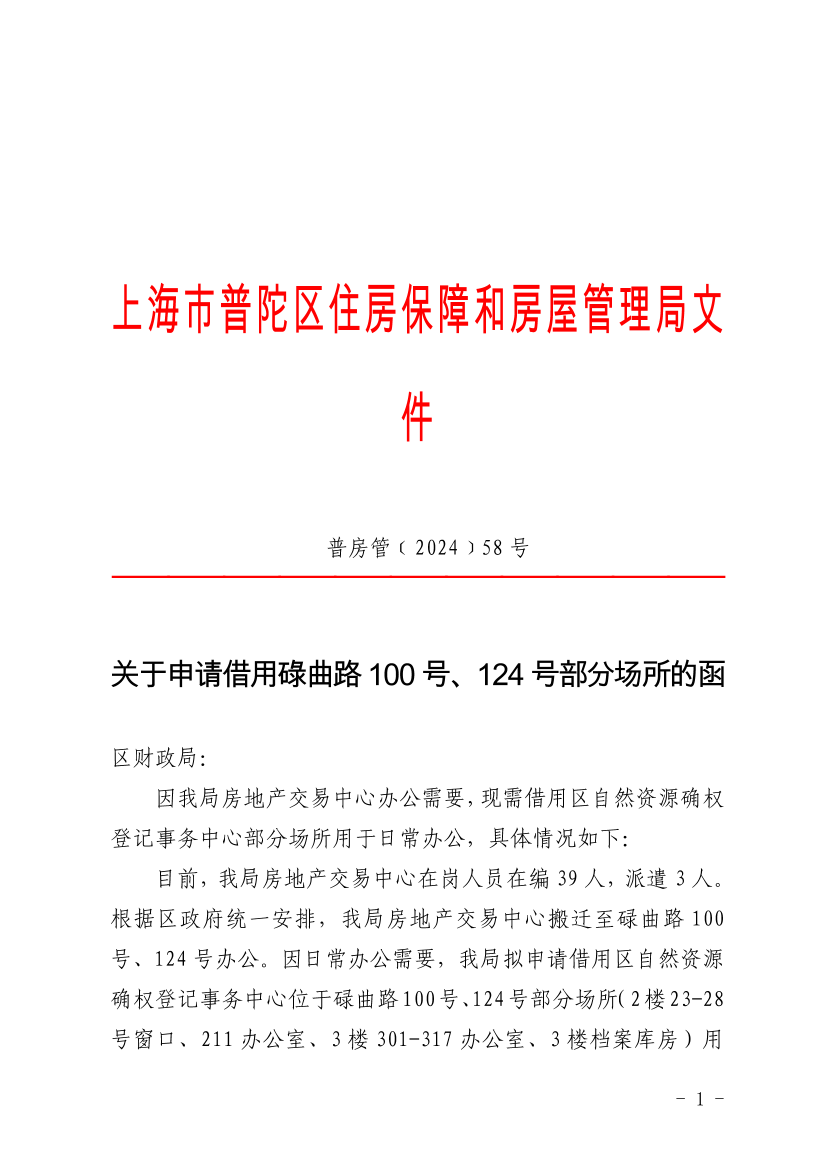 目前,我局房地产交易中心在岗人员在编39人,派遣3人。根据区政府统一安排,我局房地产交易中心搬迁至碌曲路100号、124号办公。因日常办公需要,我局拟申请借用区自然资源确权登记事务中心位于碌曲路100号、124号部分场所(2楼23-28号窗口、211办公室、3楼301-317办公室、3楼档案库房)用于日常办公,借用面积共1031平方米(不含二楼大厅公用部位),借用期限三年。