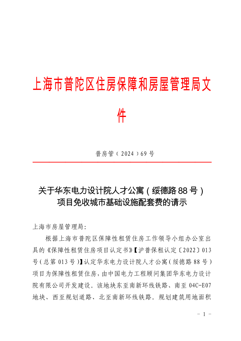 现该公司提出对该项目实行免缴城市基础设施配套费的申请,我局对该基地情况进行核实后,根据沪房规范〔2022〕2 号文件的规定,申请华东电力设计院人才公寓(绥德路88号)项目实行免收城市基础设施配套费。