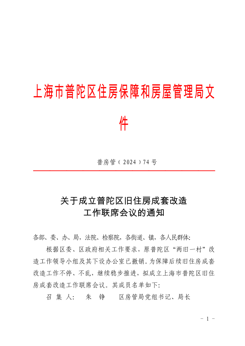 根据区委、区政府相关工作要求,原普陀区“两旧一村”改造工作领导小组及其下设办公室已撤销。为保障后续旧住房成套改造工作不停、不乱,继续稳步推进,拟成立上海市普陀区旧住房成套改造工作联席会议。其成员名单如下: