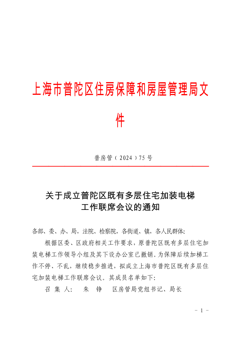 根据区委、区政府相关工作要求,原普陀区既有多层住宅加装电梯工作领导小组及其下设办公室已撤销。为保障后续加梯工作不停、不乱,继续稳步推进,拟成立上海市普陀区既有多层住宅加装电梯工作联席会议。其成员名单如下: