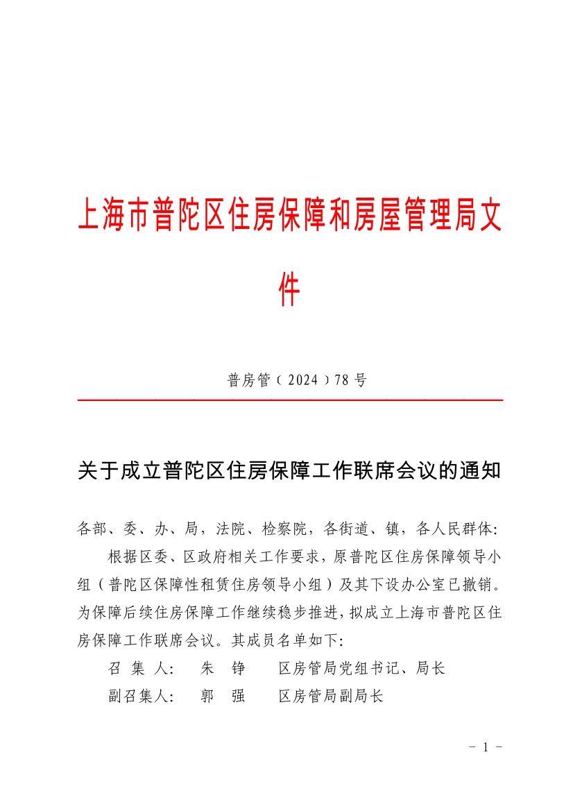 根据区委、区政府相关工作要求,原普陀区住房保障领导小组(普陀区保障性租赁住房领导小组)及其下设办公室已撤销。为保障后续住房保障工作继续稳步推进,拟成立上海市普陀区住房保障工作联席会议。其成员名单如下: