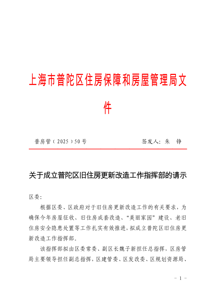 根据区委、区政府对于旧住房更新改造工作的有关要求,为确保今年房屋征收、旧住房成套改造、“美丽家园”建设、老旧住房安全隐患处置等工作扎实有效推进,拟成立普陀区旧住房更新改造工作指挥部。