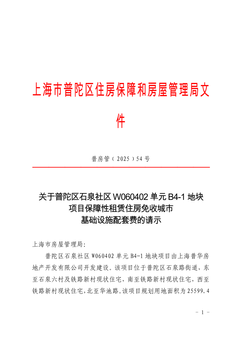 关于普陀区石泉社区W060402单元B4-1地块项目保障性租赁住房免收城市基础设施配套费的请示