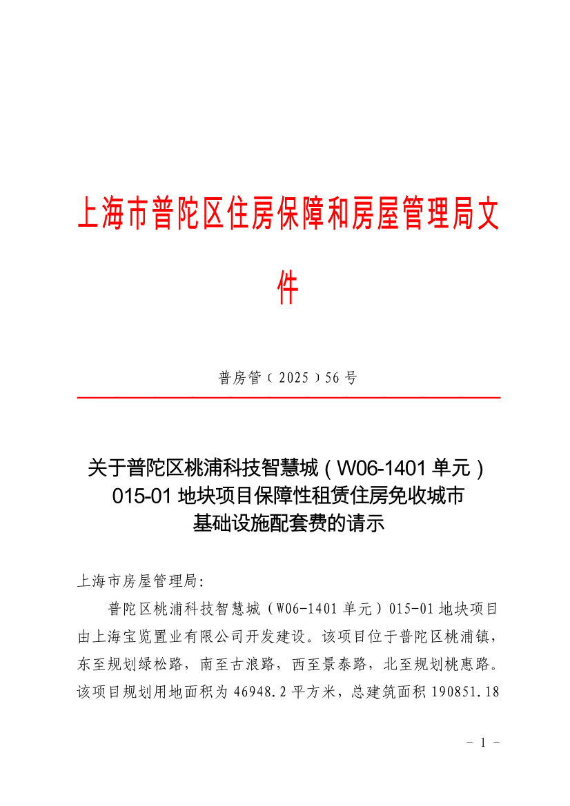 关于普陀区桃浦科技智慧城(W06-1401单元)015-01地块项目保障性租赁住房免收城市基础设施配套费的请示