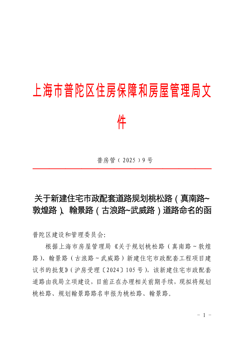 关于新建住宅市政配套道路规划桃松路(真南路~敦煌路)、翰景路(古浪路~武威路)道路命名的函