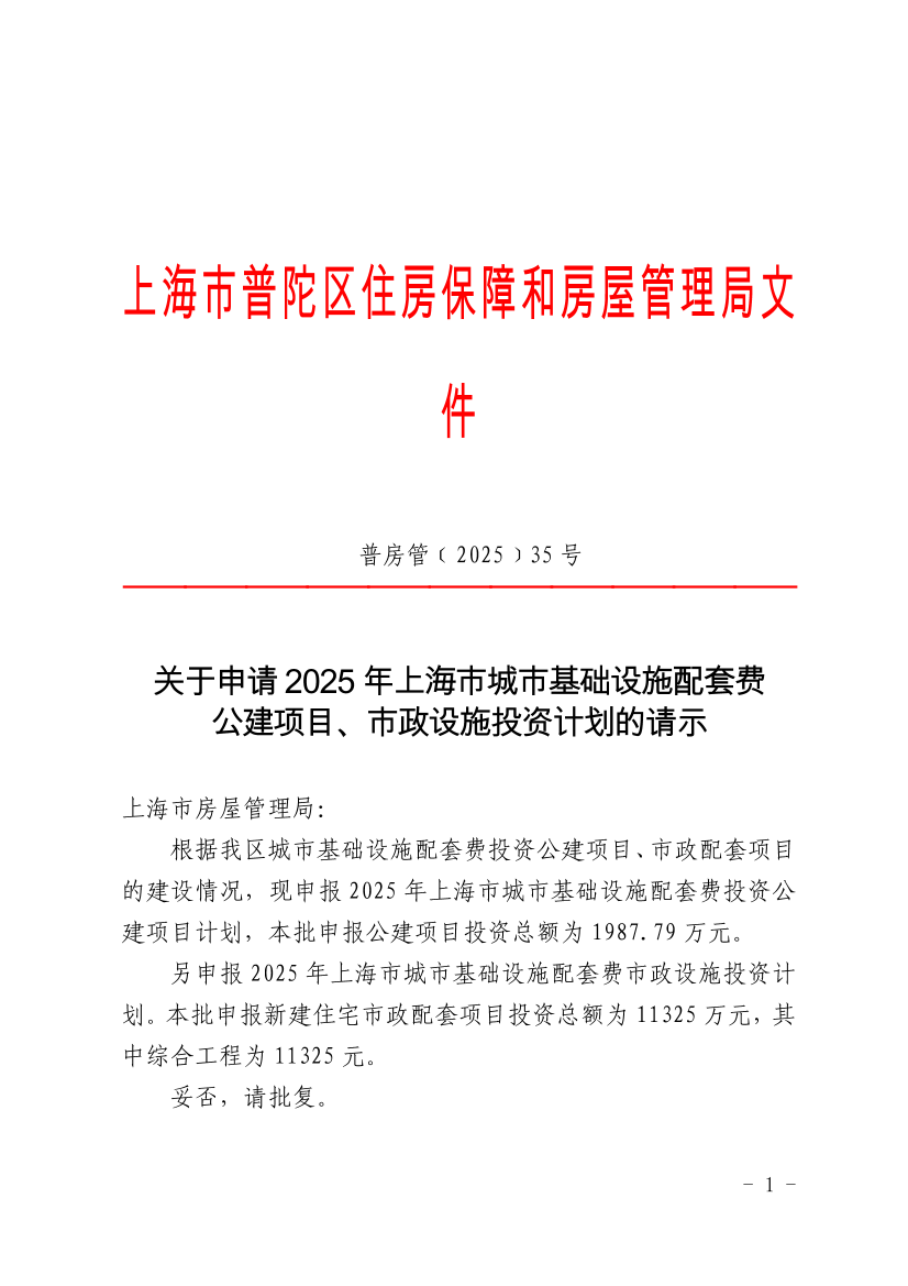另申报2025年上海市城市基础设施配套费市政设施投资计划。本批申报新建住宅市政配套项目投资总额为11325万元,其中综合工程为11325元。