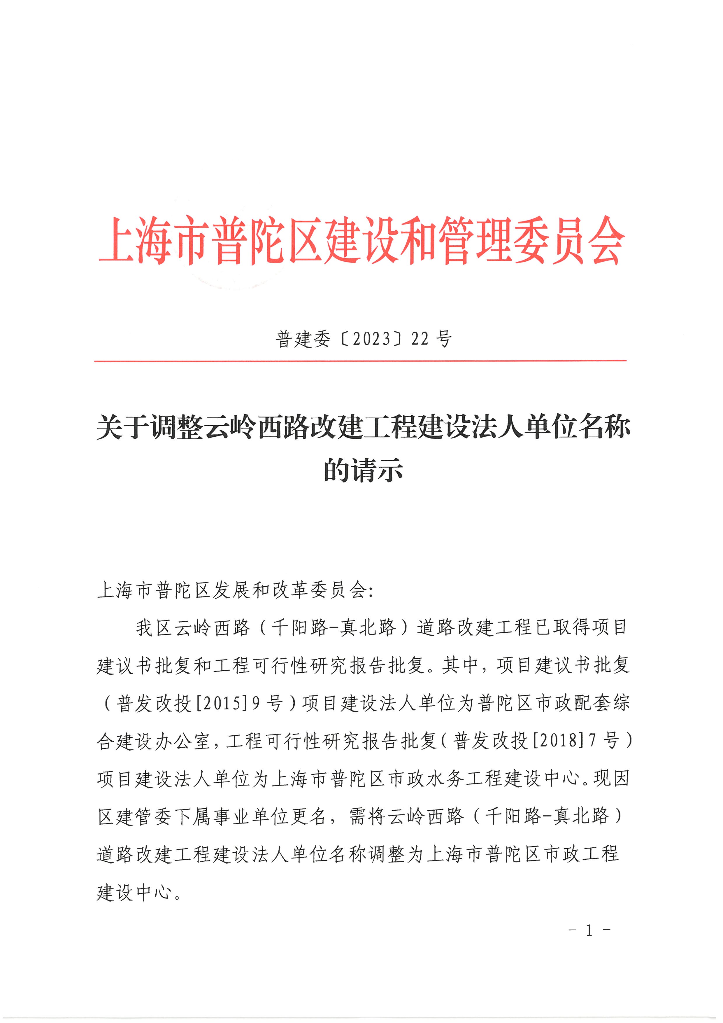 我区云岭西路(千阳路-真北路)道路改建工程已取得项目建议书批复和工程可行性研究报告批复。其中,项目建议书批复(普发改投[2015]9号)项目建设法人单位为普陀区市政配套综合建设办公室,工程可行性研究报告批复(普发改投[2018]7号)项目建设法人单位为上海市普陀区市政水务工程建设中心。现因区建管委下属事业单位更名,需将云岭西路(千阳路-真北路)道路改建工程建设法人单位名称调整为上海市普陀区市政工程建设中心。