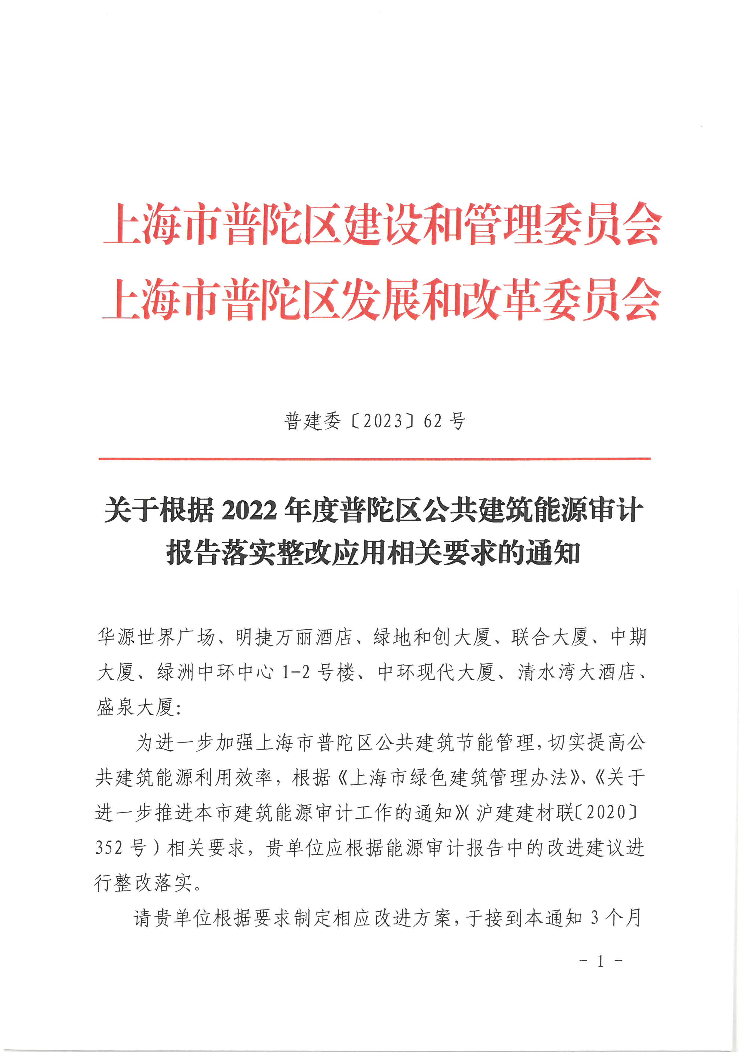 关于根据2022年度普陀区公共建筑能源审计报告落实整改应用相关要求的通知