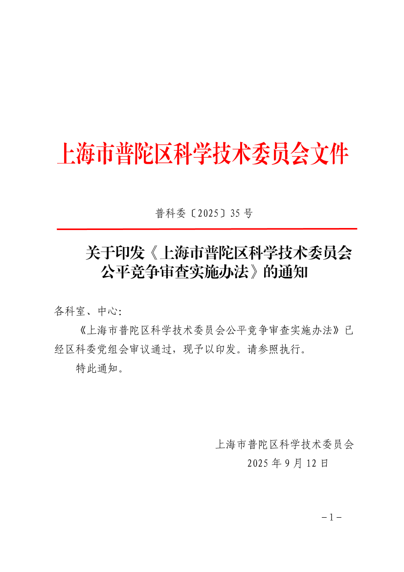 关于印发《上海市普陀区科学技术委员会公平竞争审查实施办法》的通知