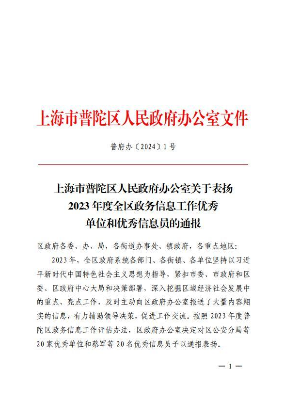 上海市普陀区人民政府办公室关于表扬2023年度全区政务信息工作优秀单位和优秀信息员的通报