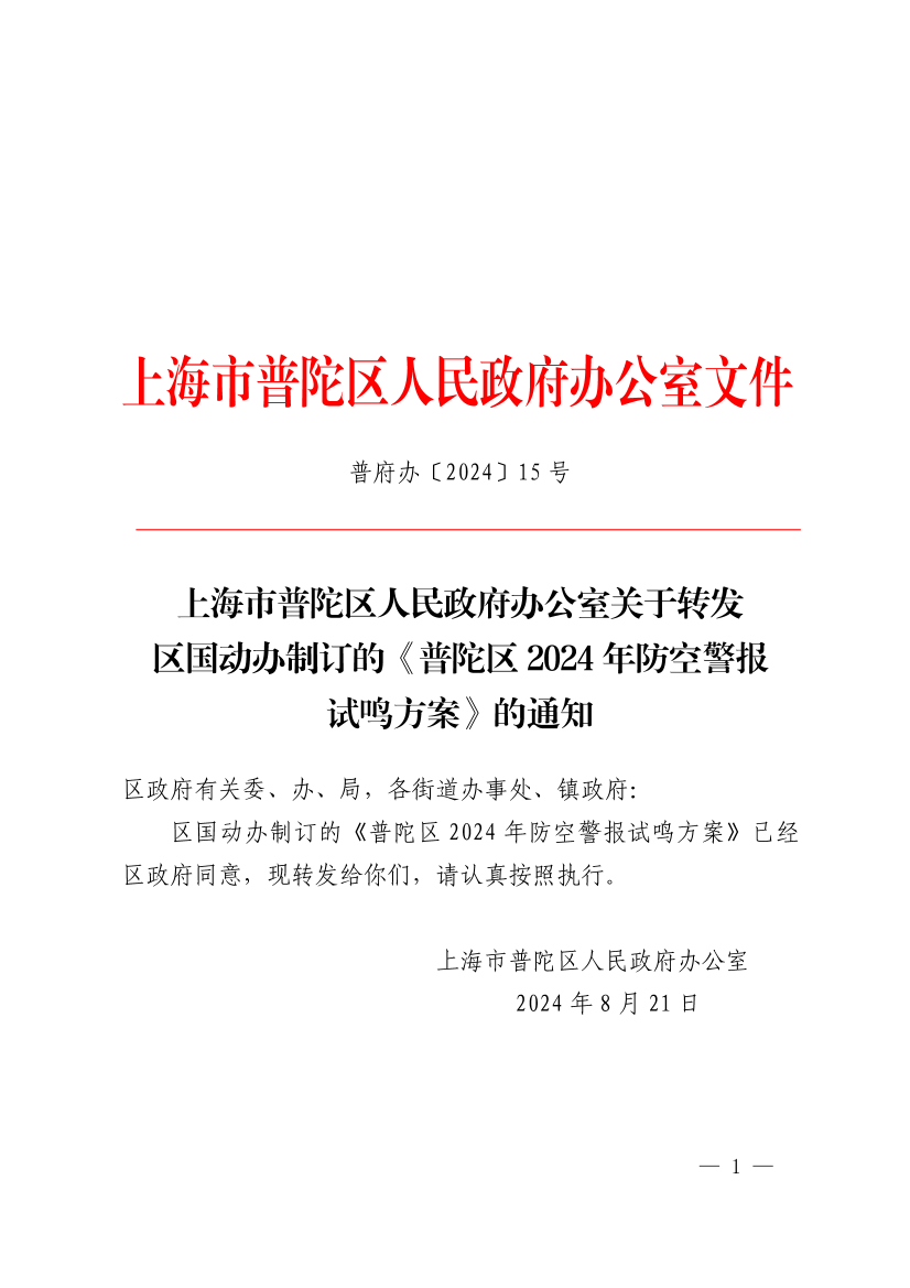 上海市普陀区人民政府办公室关于转发区国动办制订的《普陀区2024年防空警报试鸣方案》的通知