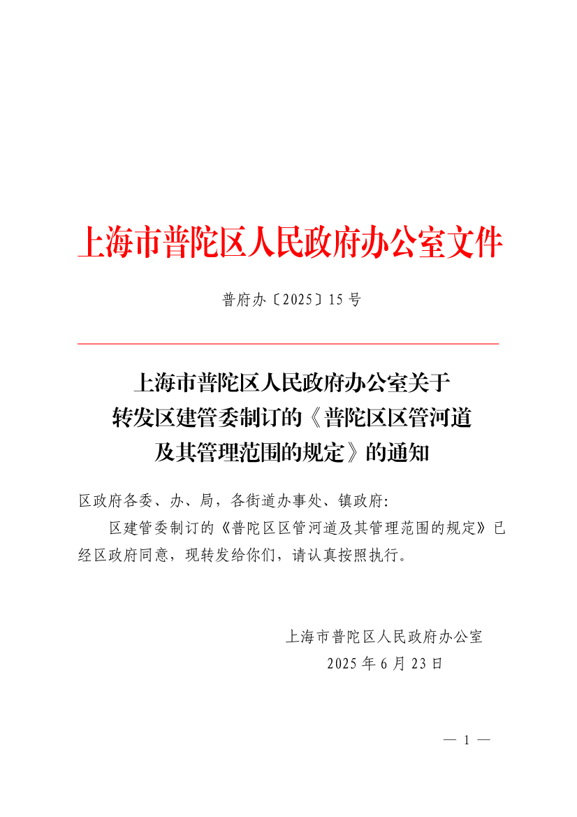 区建管委制订的《普陀区区管河道及其管理范围的规定》已经区政府同意,现转发给你们,请认真按照执行。