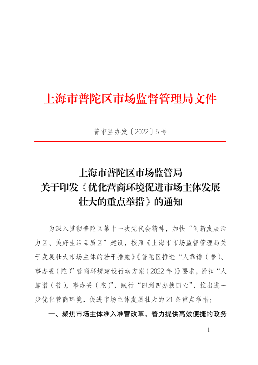 为深入贯彻普陀区第十一次党代会精神,加快“创新发展活力区、美好生活品质区”建设,按照《上海市市场监督管理局关于发展壮大市场主体的若干措施》《普陀区推进“人靠谱(普)、事办妥(陀)”营商环境建设行动方案(2022年)》要求,紧扣“人靠谱(普),事办妥(陀)”,践行“四到四办换四心”,推出进一步优化营商环境,促进市场主体发展壮大的21条重点举措: