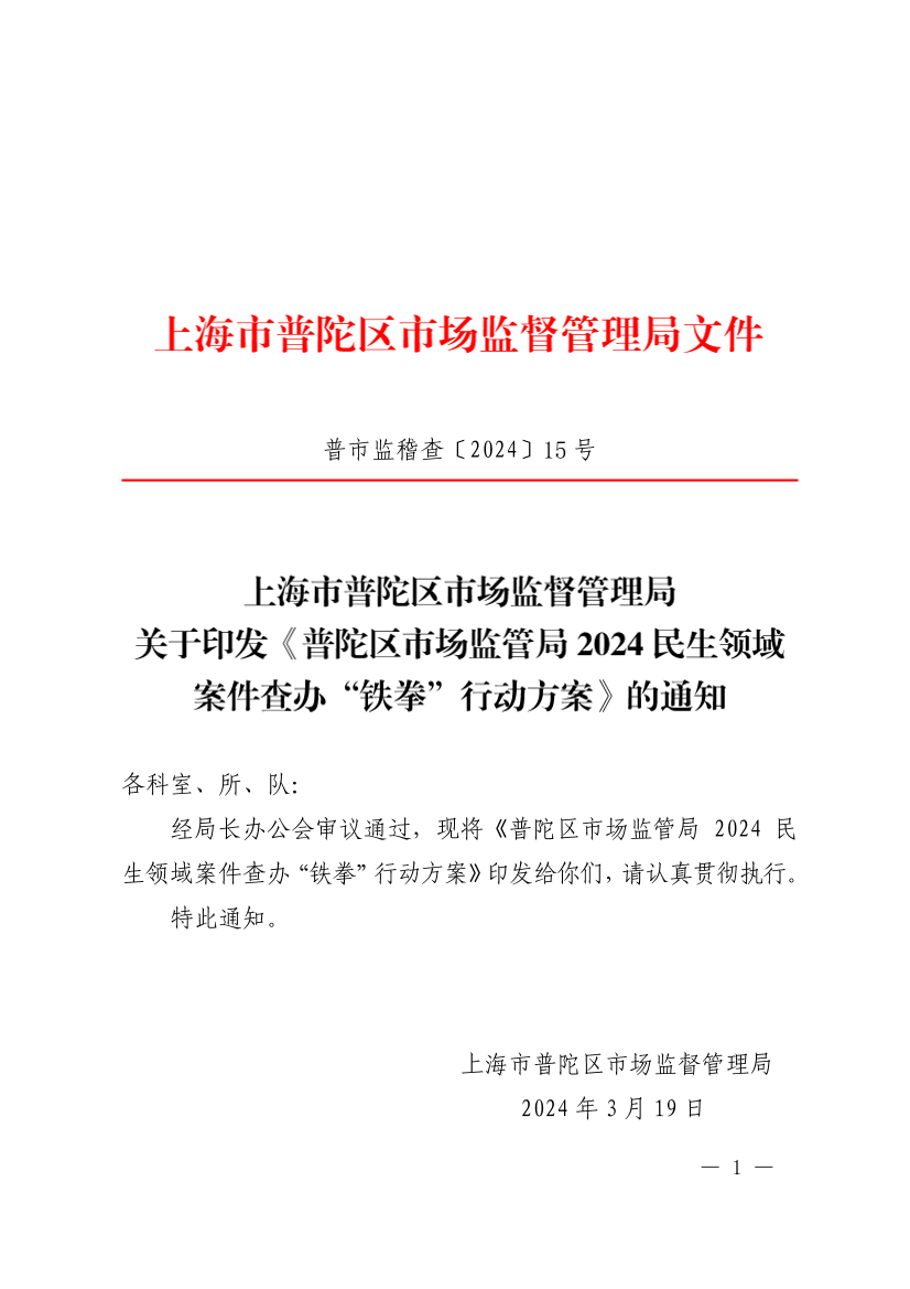 上海市普陀区市场监督管理局关于印发《普陀区市场监管局2024民生领域案件查办“铁拳”行动方案》的通知