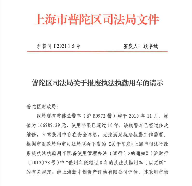 我局现有雪佛兰警车(沪BD972警)购于2010年11月,原值为166989.29元,使用年限已超过10年。该辆警车已经过多次维修,日常使用中存在安全隐患,无法满足执法执勤工作需要。根据市财政局和市司法局联合下发的《关于印发<上海市司法行政系统执法执勤用车配备使用管理办法(试行)>的通知》(沪财行〔2013〕78号)中“使用年限超过8年的执法执勤用车可以更新”的有关规定,经上海新中创资产评估有限公司评估,其采用市场法进行评估,残余价值为297元。现申请报废上述车辆。