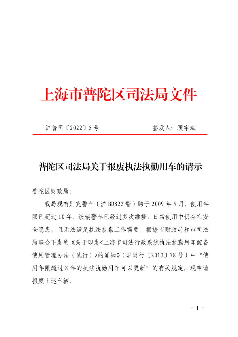 我局现有别克警车(沪BD823警)购于2009年5月,使用年限已超过10年。该辆警车已经过多次维修,日常使用中仍存在安全隐患,且无法满足执法执勤工作需要。根据市财政局和市司法局联合下发的《关于印发<上海市司法行政系统执法执勤用车配备使用管理办法(试行)>的通知》(沪财行〔2013〕78号)中“使用年限超过8年的执法执勤用车可以更新”的有关规定,现申请报废上述车辆。