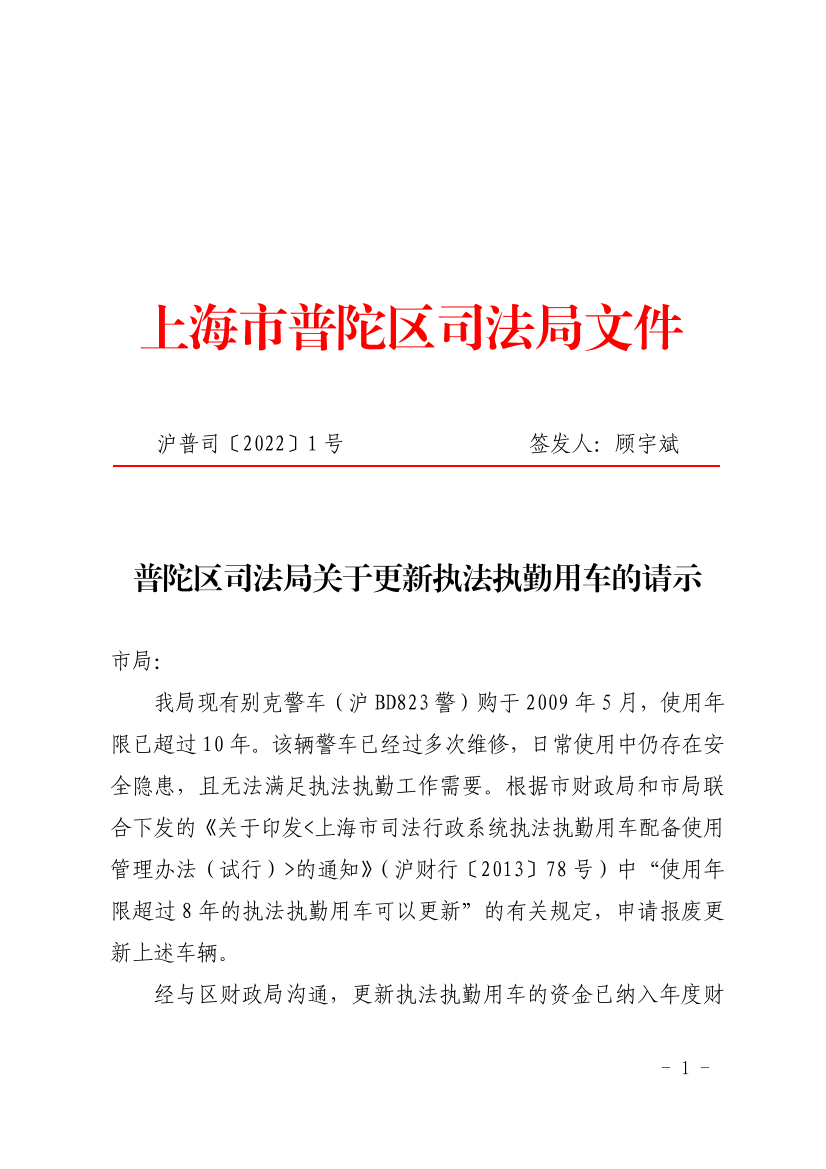 普陀区司法局关于更新执法执勤用车的请示