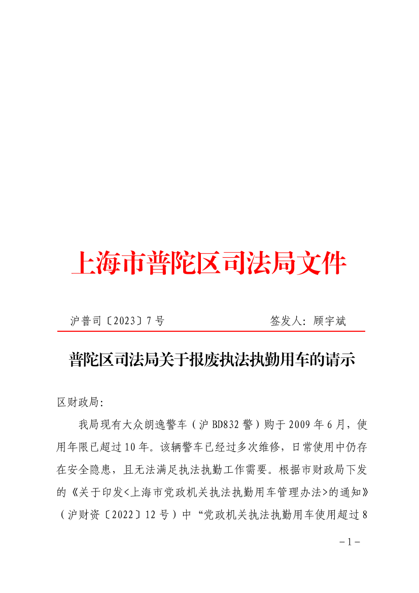 我局现有大众朗逸警车(沪BD832警)购于2009年6月,使用年限已超过10年。该辆警车已经过多次维修,日常使用中仍存在安全隐患,且无法满足执法执勤工作需要。根据市财政局下发的《关于印发<上海市党政机关执法执勤用车管理办法>的通知》(沪财资〔2022〕12号)中“党政机关执法执勤用车使用超过8年的可以更新”的有关规定,现申请报废上述车辆。