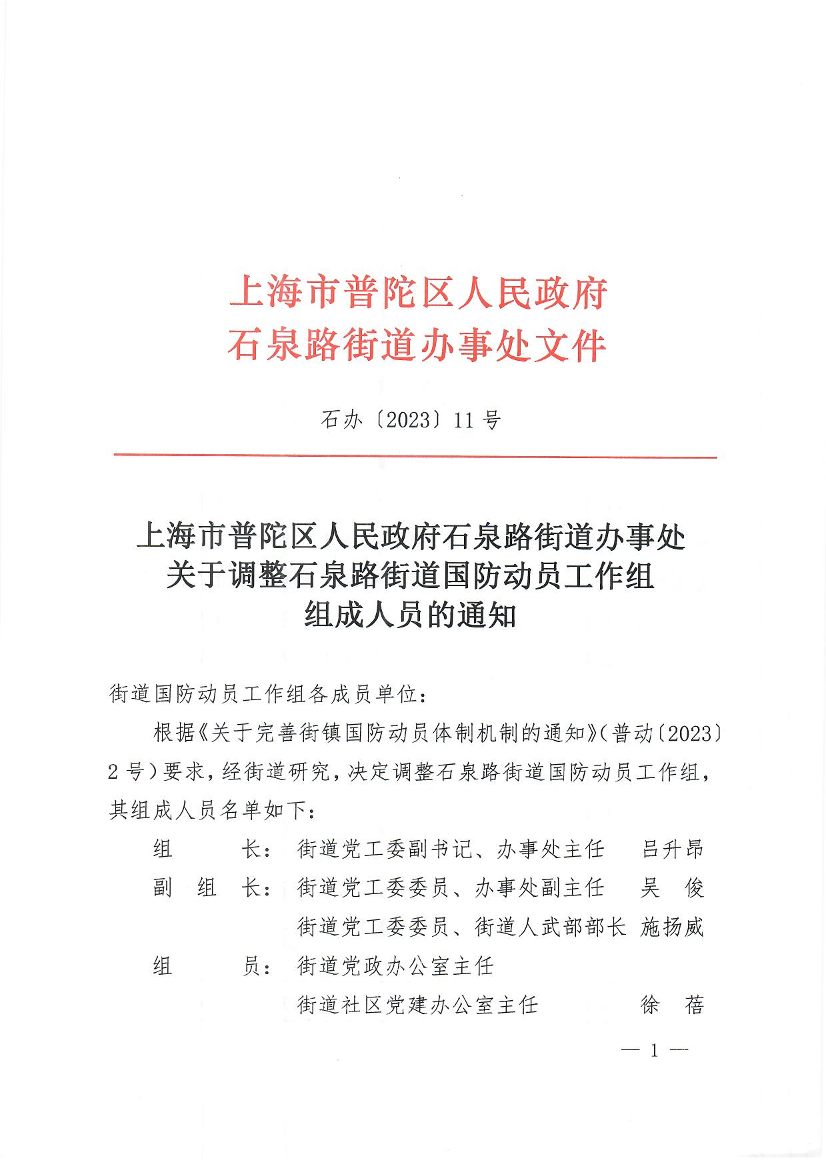 根据《关于完善街镇国防动员体制机制的通知》(普动〔2023〕2号)要求,经街道研究,决定调整石泉路街道国防动员工作组,其组成人员名单如下: