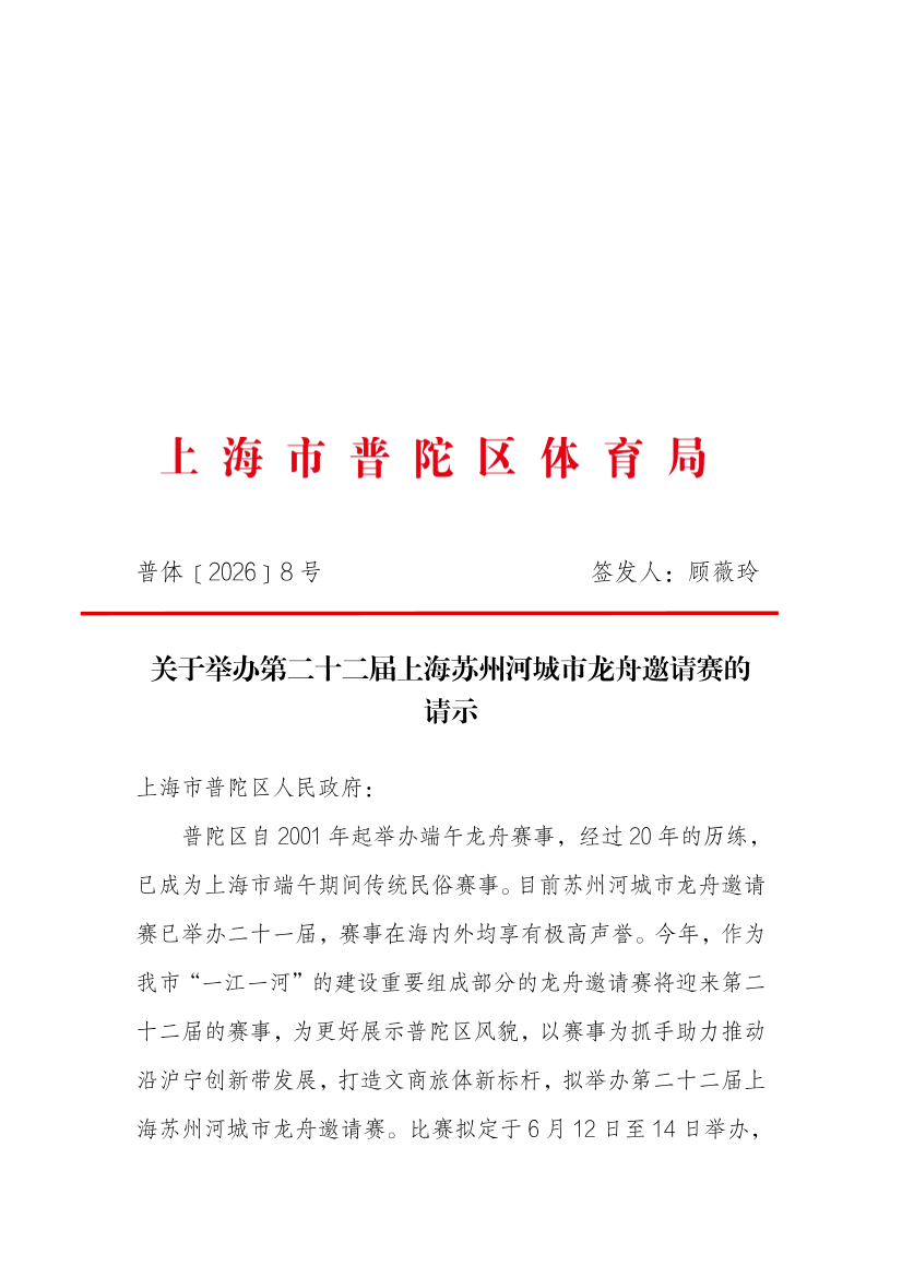 关于举办第二十二届上海苏州河城市龙舟邀请赛的请示